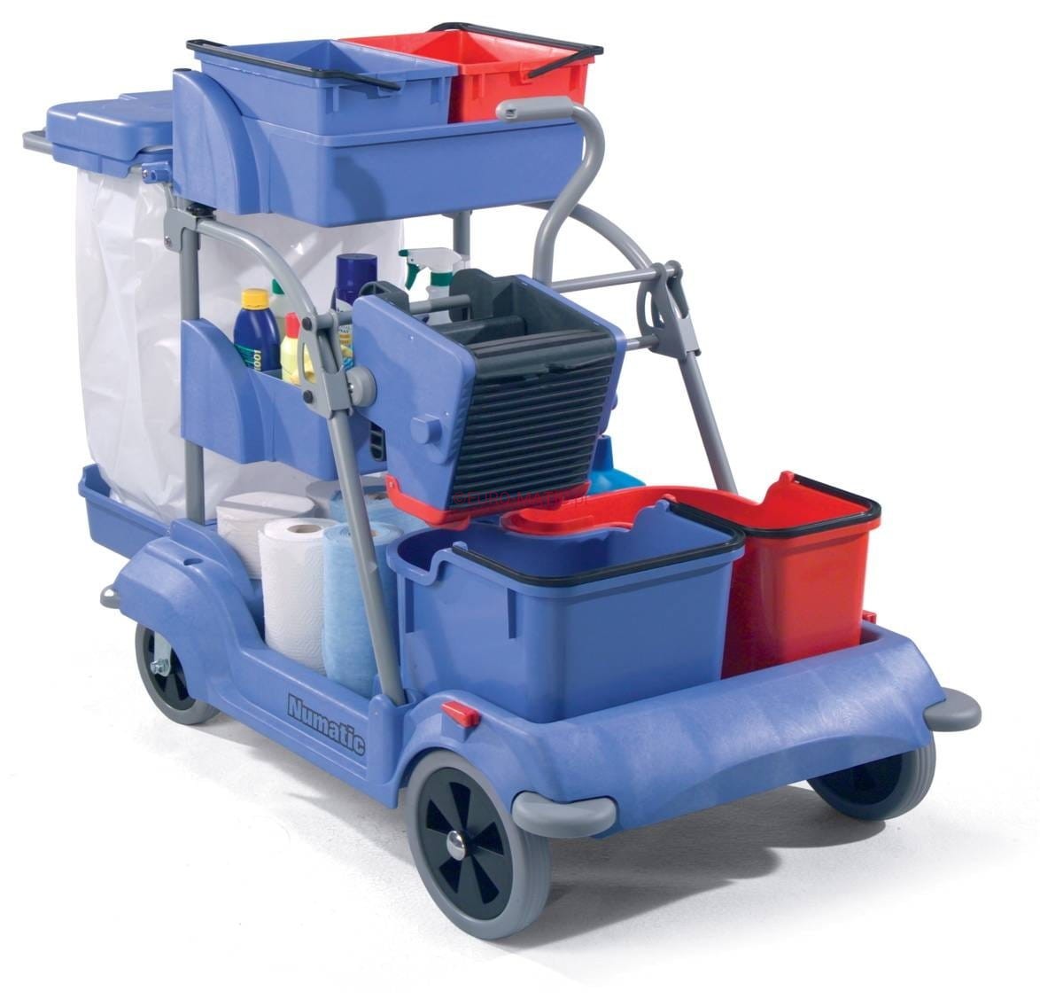 Duży wózek do sprzątania profesjonalnego. Numatic CCAT5/120 jest oparty na platformie z dużymi kołami, które cicho się toczą nawet po nierównej podłodze. Na pokładzie zmieszczono podwójne wiadra do mycia podłóg z wyciskarką, pojemnik z pokrywą na śmieci oraz 2 głębokie kuwety z wiaderkami na akcesoria. Od wózka NCC1/120 różni się tym, że ma większe kuwety i wiaderka na akcesoria. Składaną ramę wykonano ze stali, a bazę wózka z odpornego na pękniecia tworzywa Structofoam. Model dostępny jest w wersji z pokrywą podwójnie dzieloną (symbol CCAT5/140).